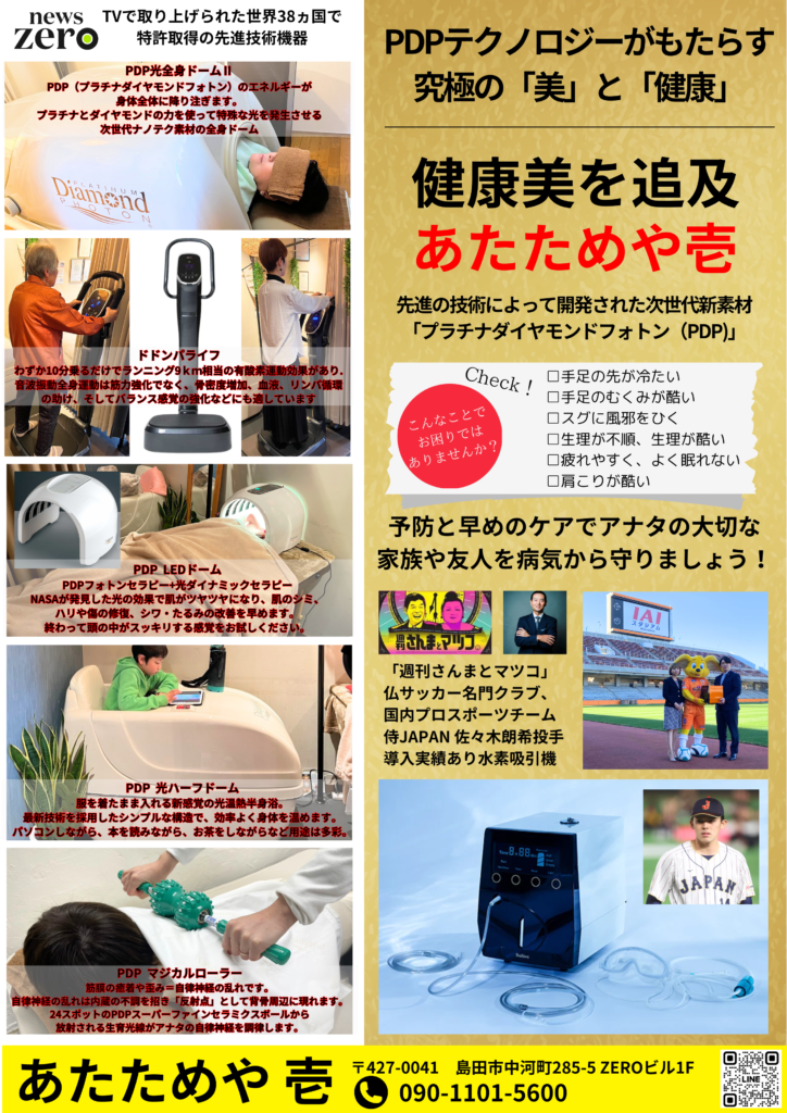 PDPテクノロジーがもたらす究極の「美」と「健康」先進の技術によって開発された次世代新素材「プラチナダイヤモンドフォトン(PDP)」。優れた温熱機能は、直接プラチナダイヤモンドフォトンのエネルギー源となって相乗効果を生み出し、上半身から足裏までドーム全体から光のシャワーとなって降り注がれます。適度な発汗を促すほか、単なる温熱効果にはない「光」のパワーが、これまでにない究極の癒しを提供し、「美」と「健康」をサポートします。